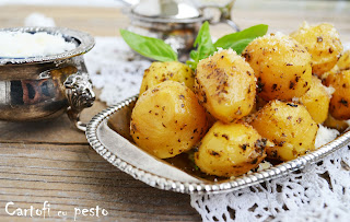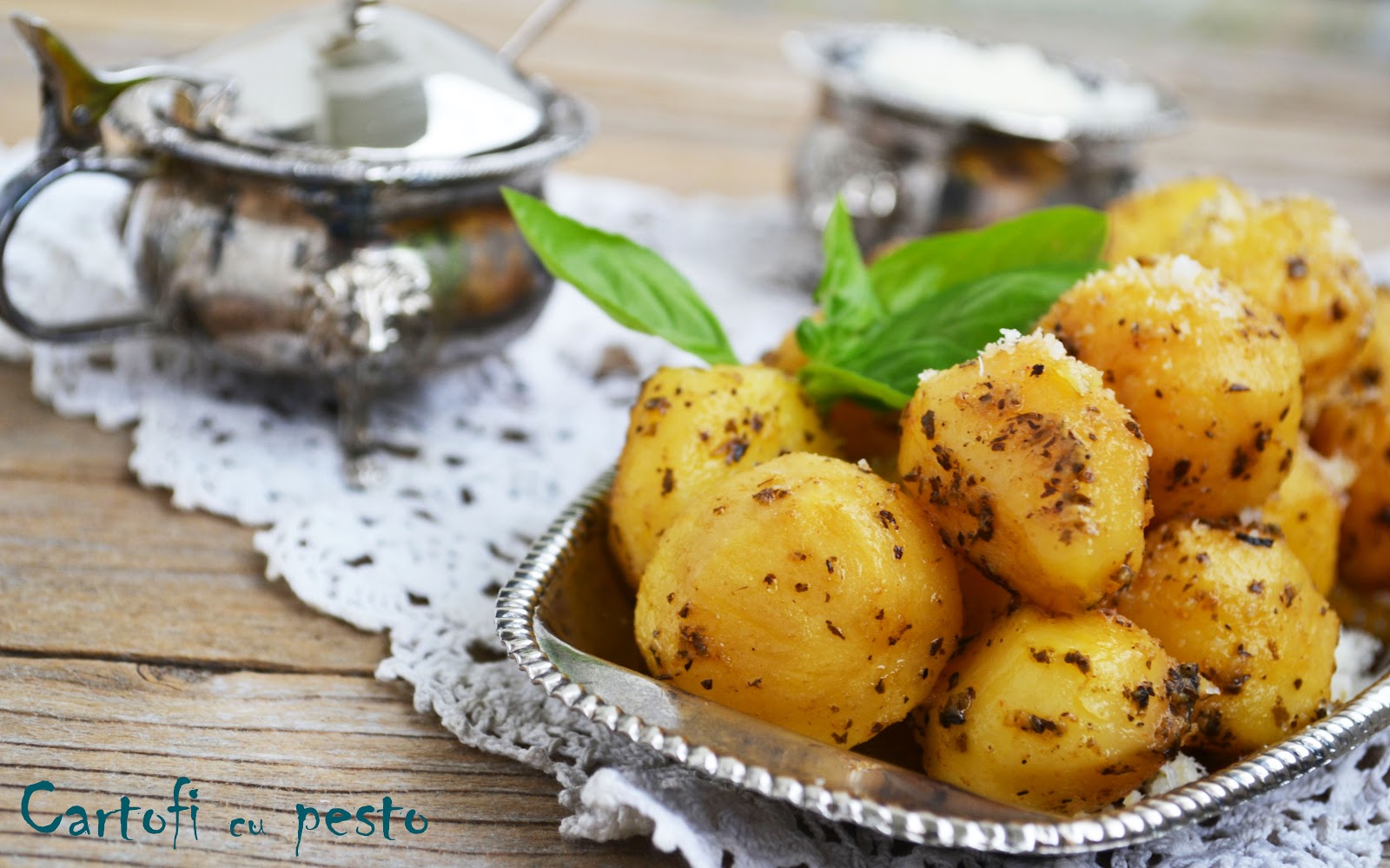 Cartofii se curata si se spala. Peste ei se toarna urleiul si condimentele, apoi se pun intr-o tava si se dau la cuptor pana cand sunt patrunsi bine. Se scot de la cuptor, se amesteca cu pesto si se servesc cu parmesan razuit pe deasupra.