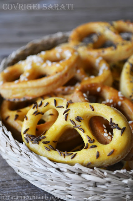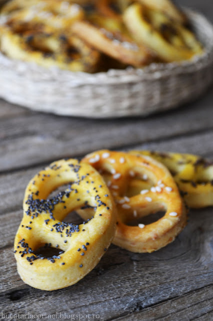 Pentru ca savuram cu drag oricand un covrigel in locul unei prajituri sau desert dulce, de sarbatori am pregatit covrigei sarati, cu telemea si tot felul de seminte. Au fost rumeni, crocanti..perfecti. Si s-au epuizat cu viteza luminii in 2 zile. Din cantitatile de mai jos ies in jur de 80 de covrigei, mai multe decat suficienti zic eu.