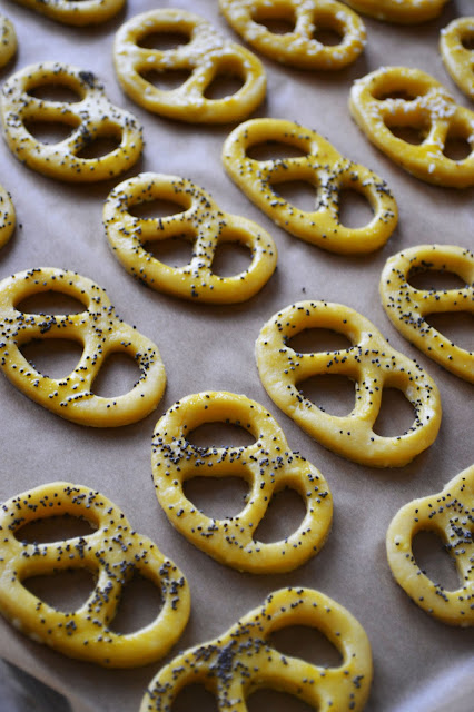 Din aluat se intind cu sucitorul paturi, apoi se decupeaza covrigeii cu forma metalica. (Pregatiti-va pe blatul de lucru o farfurioara cu faina si treceti forma metalica prin faina inainte de a-i decupa, astfel se evita lipirea aluatului de forma). Se ung pe deasupra cu ou batut si se presara seminte. Covrigeii se coc cca 30 de minute la foc mediu, pana cand sunt rumeniti.