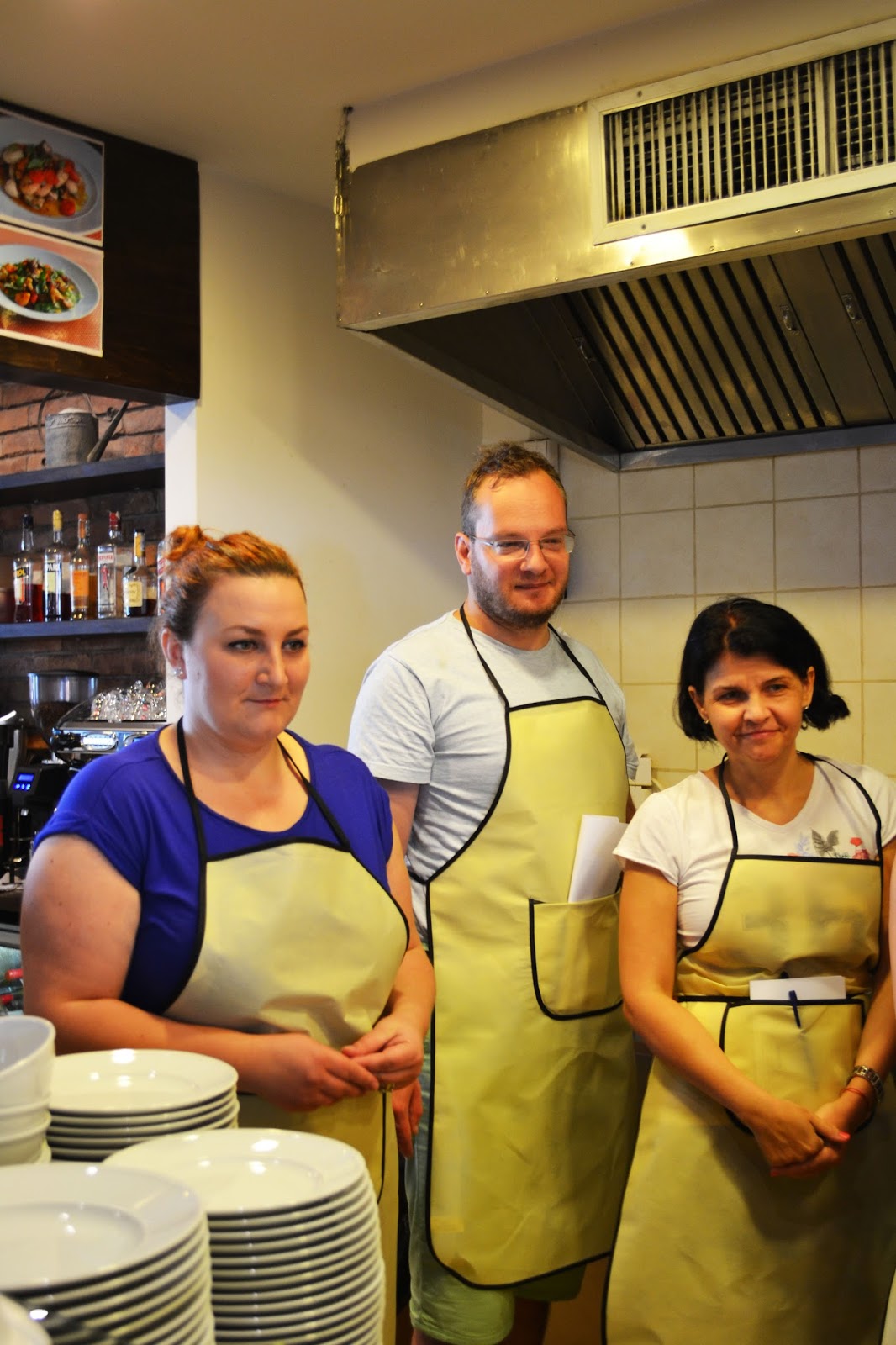 Asadar, iata-ne 12 persoane, cu sortul strans la spate si cu foile cu ingrediente in maini, adunate in bucataria restaurantului, numai ochi si urechi la chef Nicolae Craciun. Va spun drept ca nu stiam la ce sa ma astept, dar m-am tot intrebat cum vom gati noi toti acolo. Insa dupa prezentarea meniului sarcinile au fost impartite intre toti si toata lumea a avut si loc si ceva de mesterit cu cutitul pe planseta, dupa indicatiile chef-ului.