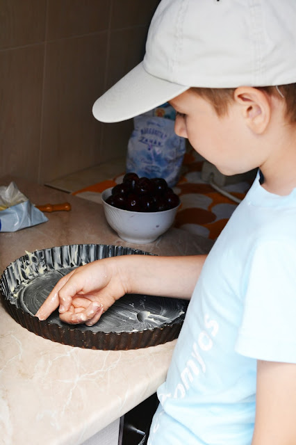 Baietii au aranjat ciresele in forma de copt pe principiul una in tava – una in burta, apoi am turnat aluatul peste ele.