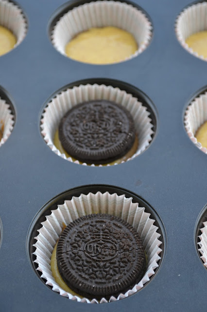 In tava de muffins se pun hartiute, iar in fiecare hartiuta se pune o lingurita de compozitie simpla (fara roscove). Se pune deasupra biscuitele oreo, apoi hartiuta se umple cu aluat, alternand cel simplu cu cel cu roscove. Puneti pune o lingurita si o lingurita, astfel o sa iasa ca si o zebra. Insa le fel de bine puteti renunta la a pune roscove sau cacao si sa folositi doar alutul simplu. Eu am preferat sa pun in doua culori doar din motive estetice.