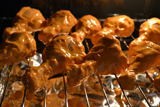 Dupa acest interval scoatem vasul si aranjam pulpele pe grill-ul cuptorului. Coacem carnea la temperatura medie, intorcand-o din cand in cand si stropindu-o cu ulei, pana cand carnea este patrunsa bine. Nu va pot da un timp, nici ca si medie, deoarece am uitat sa pornesc cronometrul cuptorului.Ca si sfat va recomand ca in tava de sub grill sa puneti folie de aluminiu, veti curata tava mult mai bine 🙂