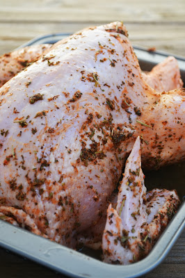 Intr-un bol se amesteca uleiul de masline cu condimentele. Se maseaza puiul cu acest amestec , avand grija sa ajunga pe toata suprafata lui. Se leaga cu ata pulpele puiului, iar pe deasupra se pun din loc in loc bucatele de unt.
