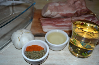 Din capatana de usturoi am pastrat 2-3 catei si restul i-am pisat si amestecat cu uleiul de masline, condimentele (chilli, oregano, busuioc si cimbru) le-am amestecat intr-un vas. Bucata de carne am uns-o cu amestecul de ulei si usturoi si am presarat amestec de condimente, apoi am invelit bucata in bacon. Am asezat carnea intr-un vas, am turnat vinul si am presarat amestec de condimente (am pus pe langa carne si cateva bucati de cartofi si usturoiul ramas).